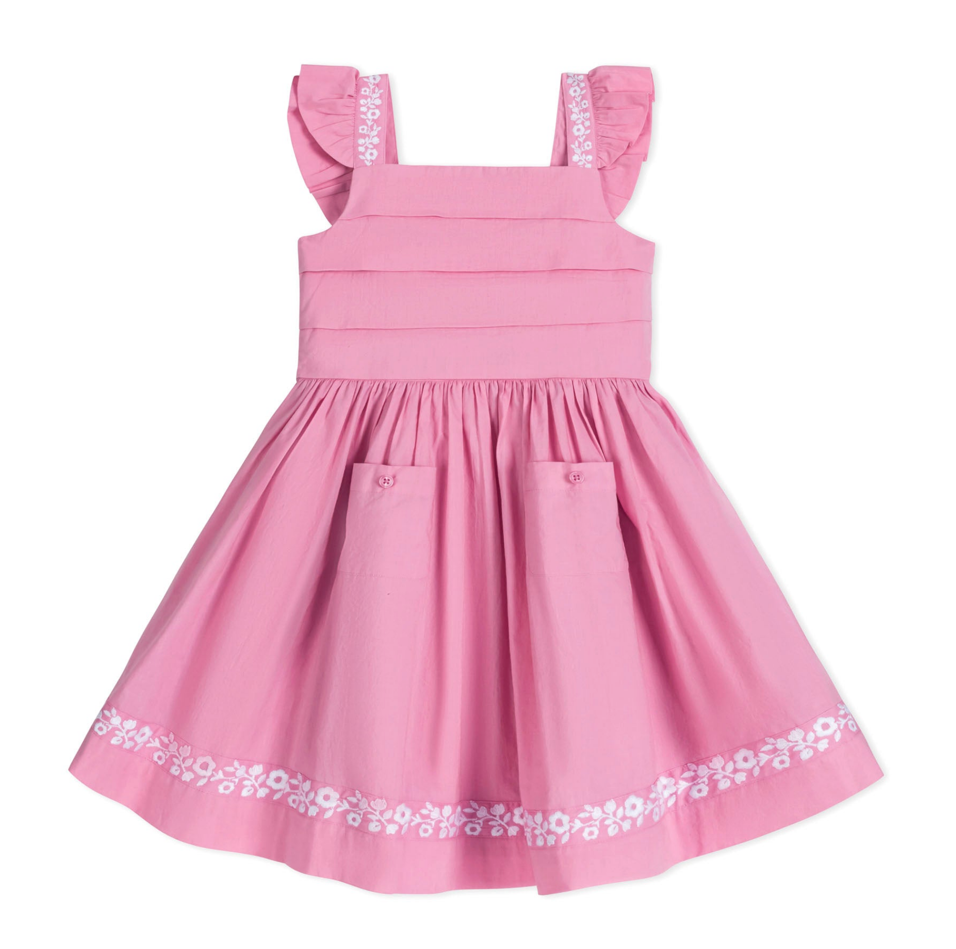 Our beautiful pleated apron dress in soft organic cotton is perfect for summer days and special occasions. Features flutter sleeves, patch pockets, a pleated bodice, and floral embroidery at the hem and shoulders. Fully lined in organic cotton with a button closure down the center back. Perfect for everything from picnics to parties.